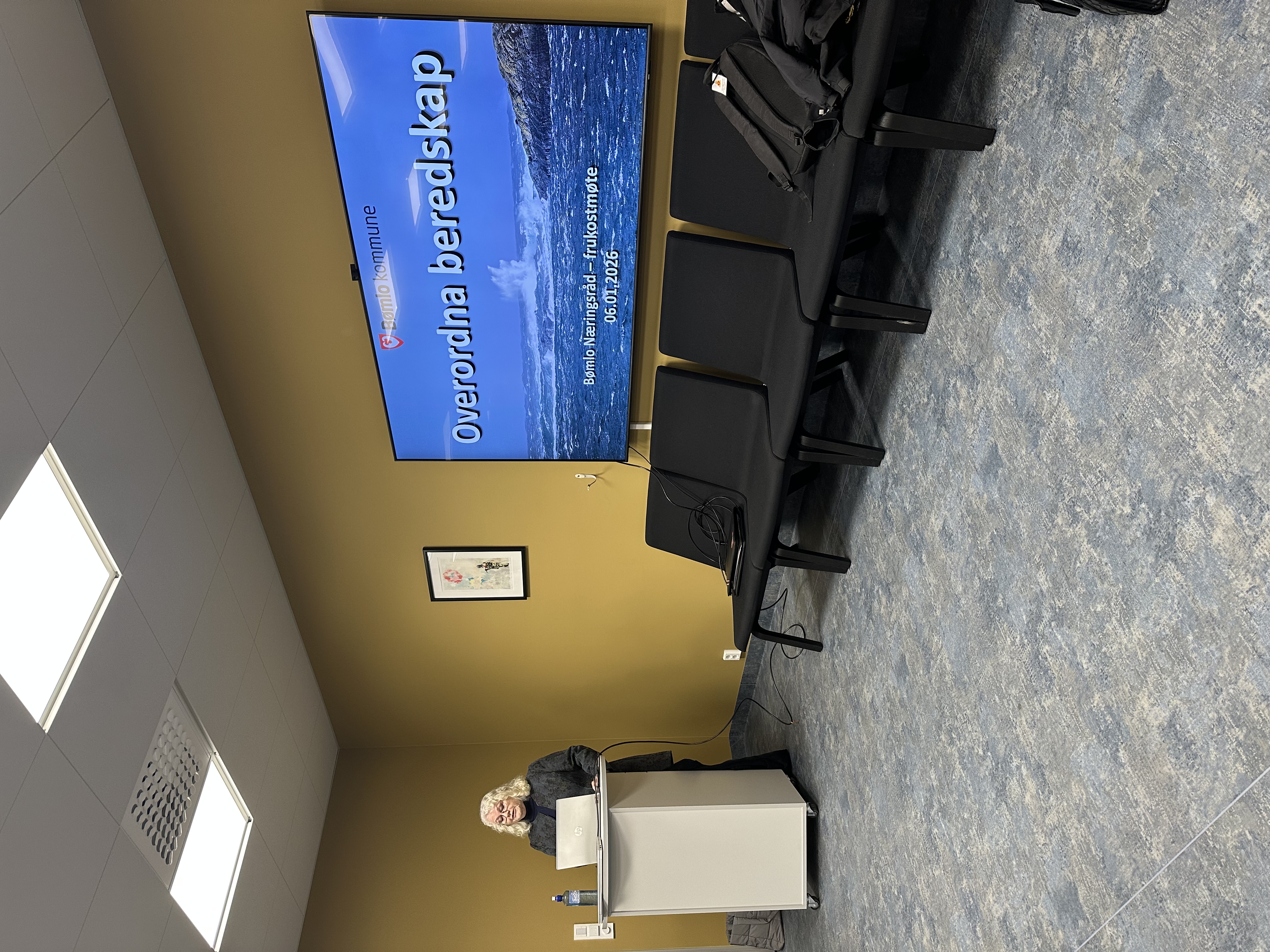 møtet med å fortelje om kommunen sitt arbeid med beredskap. Ho la vekt på at Bømlo, med sine 12 500 innbyggjarar fordelt på øyar, har særlege utfordringar knytt til ekstremvêr, ulukker og mogleg stenging av bru og ferje. Kystlinja er lang og skipsleia er tidvis svært trafikkert, noko som gjer samfunnstryggleiken ekstra viktig.