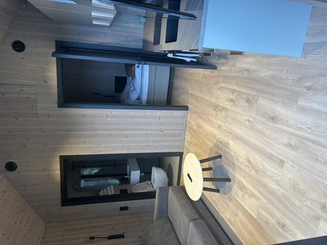 Flotte gjestehytter, innredet med kjøkken.